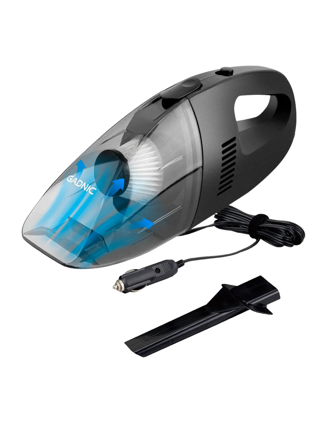 Aspiradora 12V para utilizar en el auto. Cuenta con 2 accesorios de bocas y tamaños distintos, para limpiar espacios reducidos con facilidad, y aspirar pequeñas ranuras o tapizados. Voltaje: 12V. Potencia: 75W. Uso en húmedo y seco. Cable de 3m.