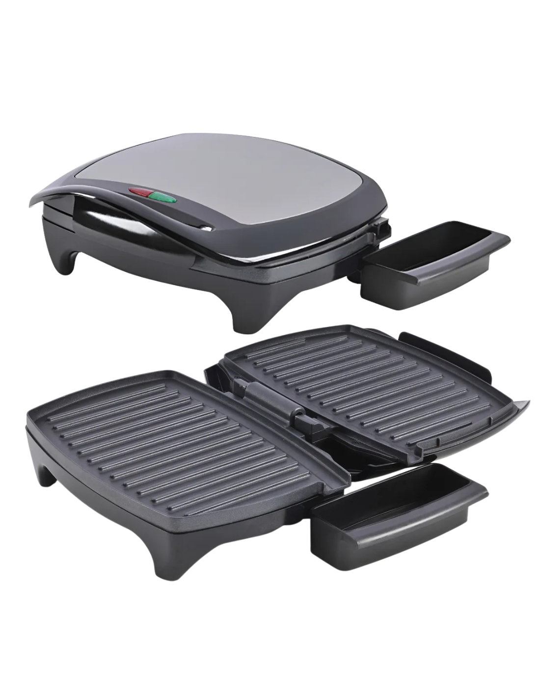 Potencia: 1280W. Medidas: 30,4 x 29 x 13,3cm. Parilla eléctrica con luz verde indicadora de uso. Material: Placa de aleación de aluminio, carcaza en baquelita, superficie antiadherente y recipiente para recibir líquidos y no ensuciar. Voltaje: 220-240V; 50/60Hz. Potencia: 1280W. Color: negro y gris.