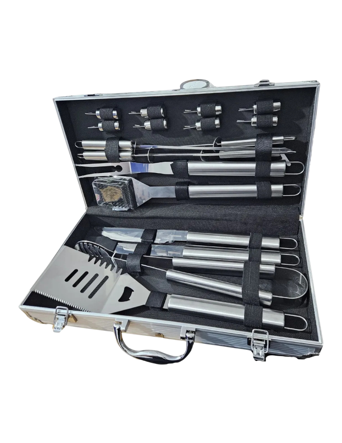 Set de asado con maletín 13 piezas. Maletín de aluminio. Medidas: 43 cm x 18 cm x 7 cm. Utensilios de acero inoxidable. Incluye: 1 tenedor, 1 cuchillo, 1 pinza, 1 espátula, 4 pinches para brochette y 4 pinches de copetín.