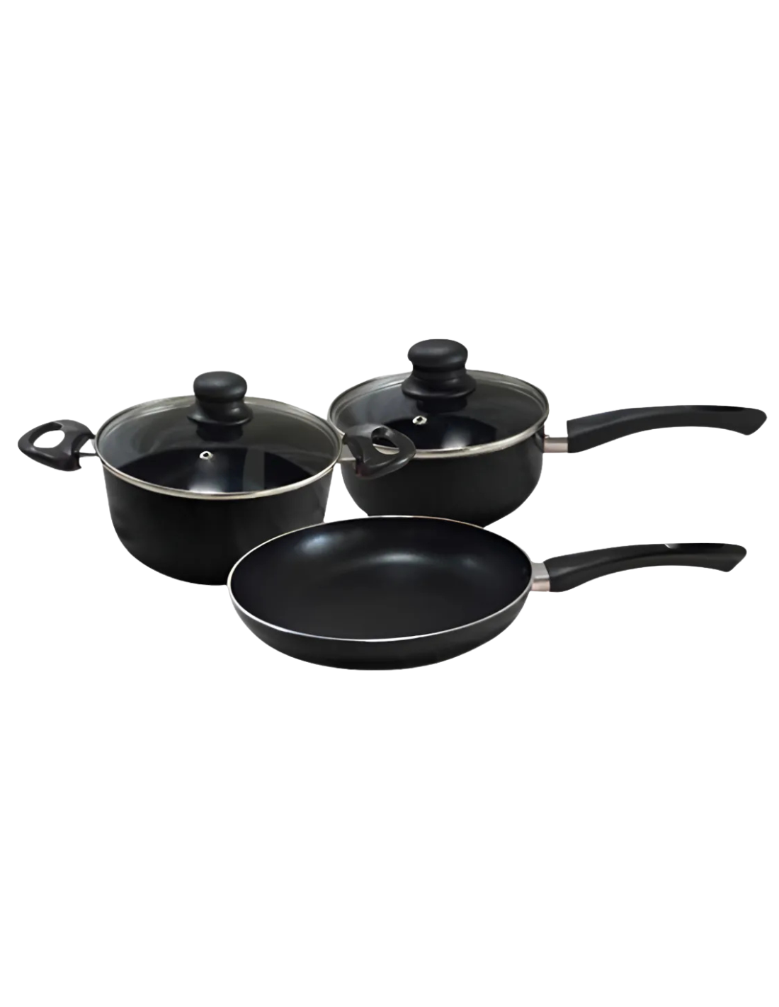 Incluye: Salsera de 16cm de diámetro x 7cm de alto con tapa de vidrio templado, cacerola de 22cm de diámetro x 9 cm de alto con tapa de vidrio templado, sartén de 20cm de diámetro x 4 cm de alto. Material Aluminio de 2mm de espesor, mangos de baquelita.